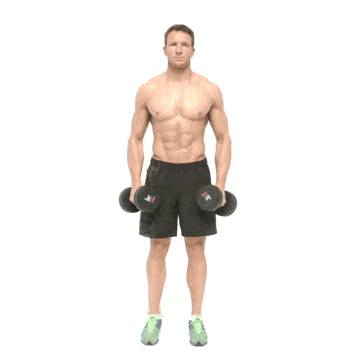 Stand upright holding two dumbbells by your sides. Place the balls of your feet on an exercise step or weight plate with your heels touching the floor. With your toes pointing forwards, raise your heels off the floor and contract your calves. Slowly return to the starting position.