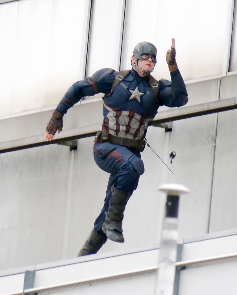 Chris Evans’ stuntman, dressed as Captain America, is seen during filming on the set of Captain America, Civil War