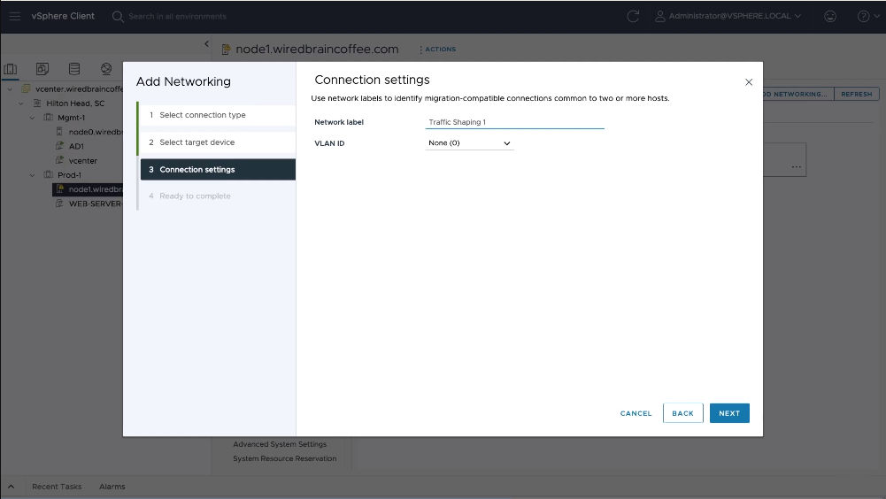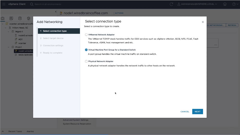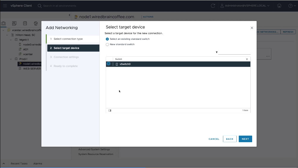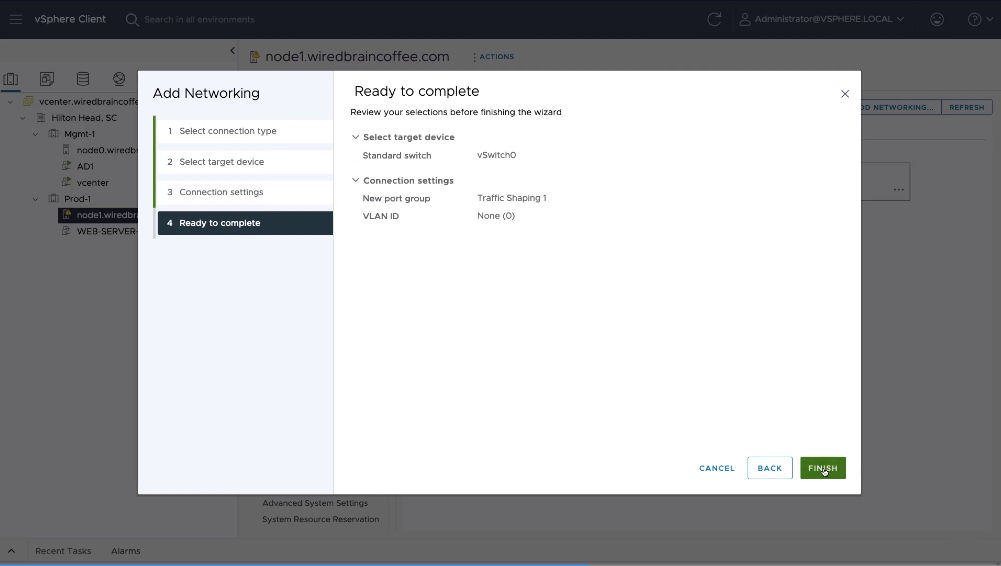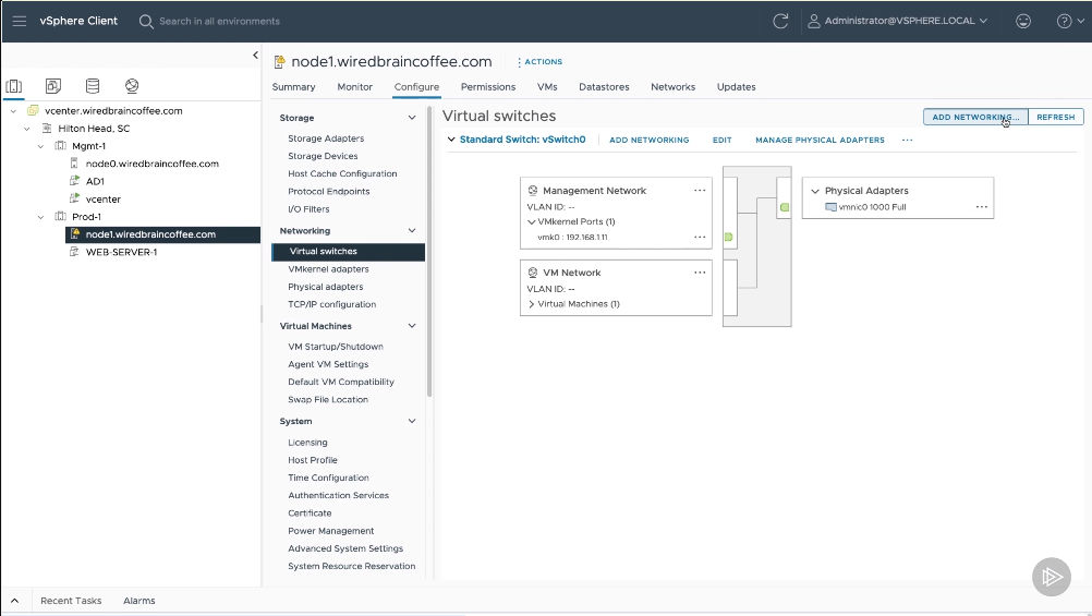 1. Go to vSphere > Hosts and Clusters > A Distributed Switch (we're picking Prod-1) > A VM under that switch (we're picking node1.wiredbraincoffee.com)
