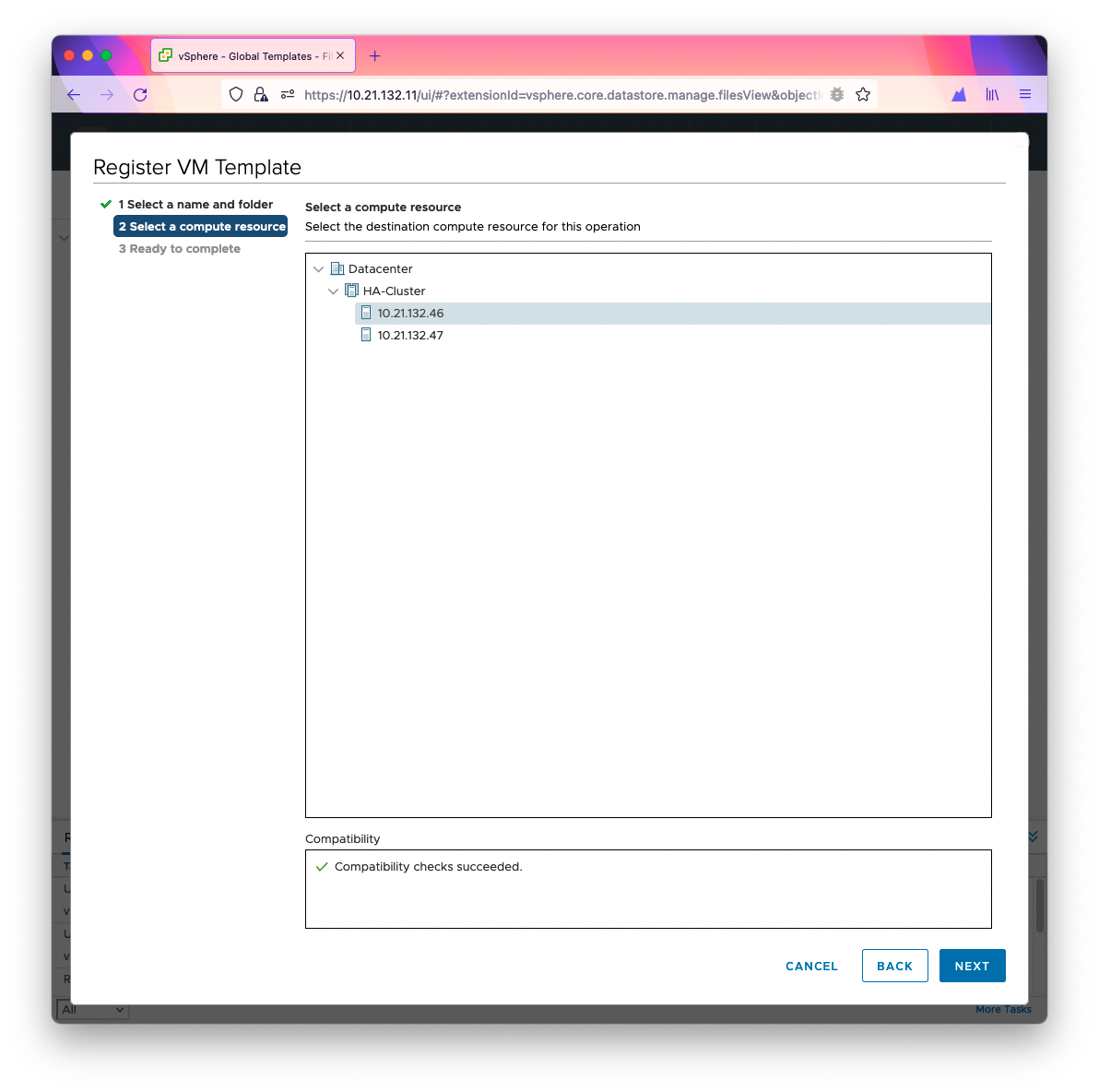 In the past you may have been instructed to select `HA-Cluster` when registering a VM Template. If you try this now you will encounter errors registering the template to HA-Cluster. Instead you should ensure that you select one of the physical parents rather than the HA-Cluster.