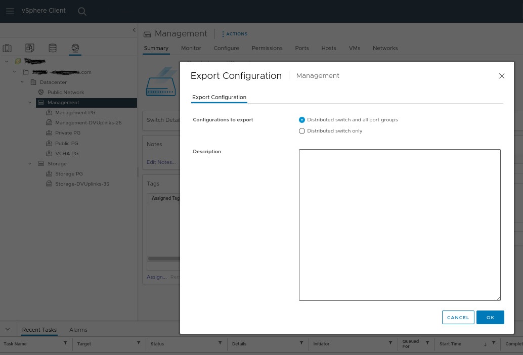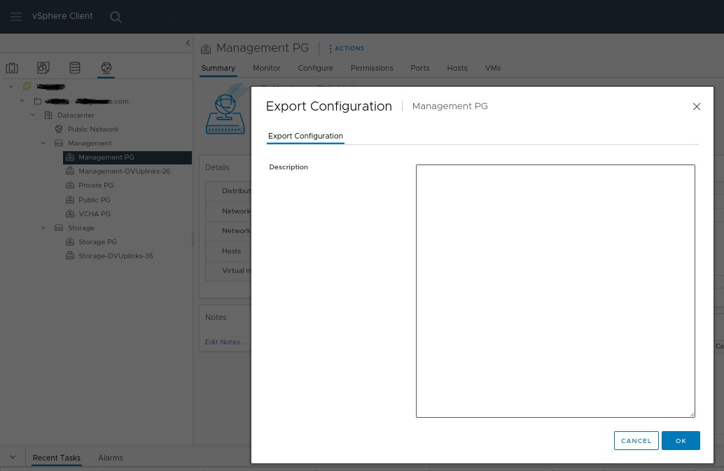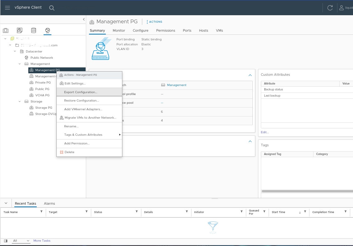 vSphere > Networking (On top left pane) > ip.address > $acct_no - example.com > Datacenter > Distributed Switch (Management or Storage) > Port Group (Management PG or Management-DVUplinks-Num or Private PG or Public PG or VCHA PG or Etc.) > Right Click > Settings