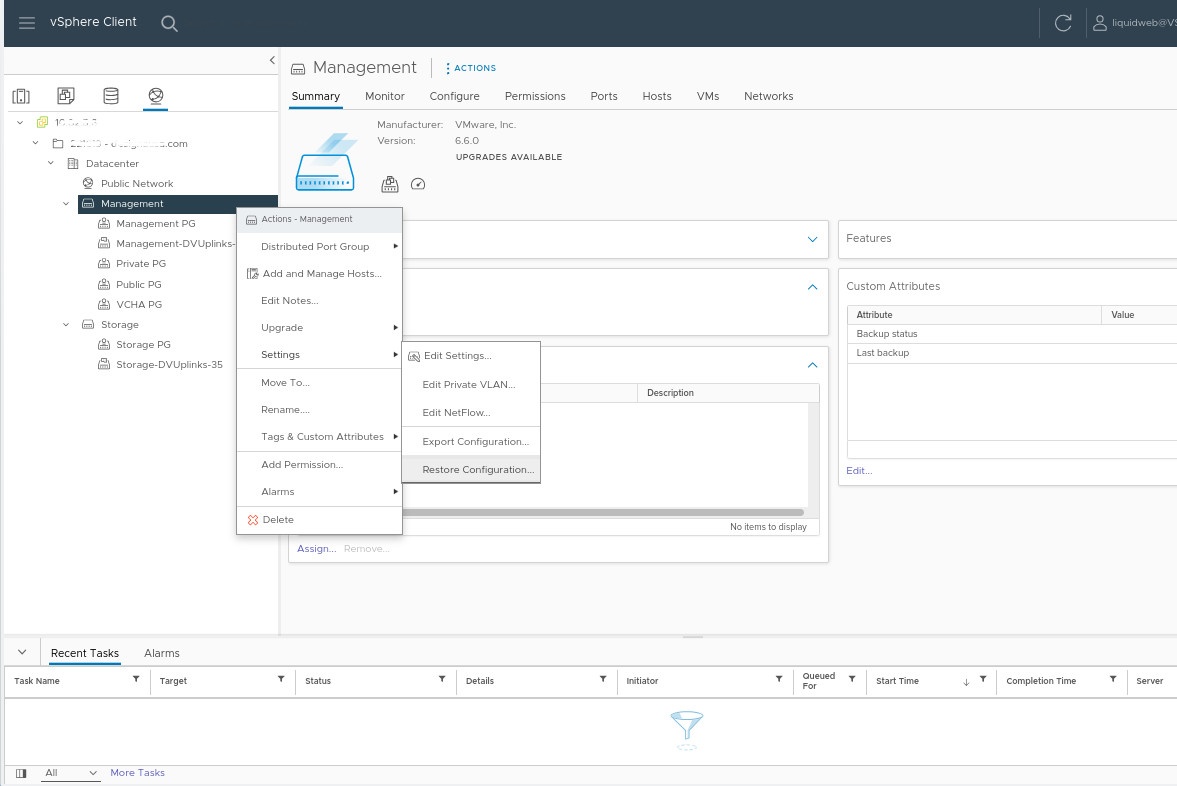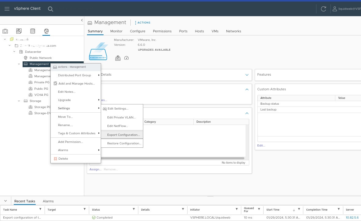 vSphere > Networking (On top left pane) > ip.address > $acct_no - example.com > Datacenter > Distributed Switch (Management or Storage) > Right Click > Settings