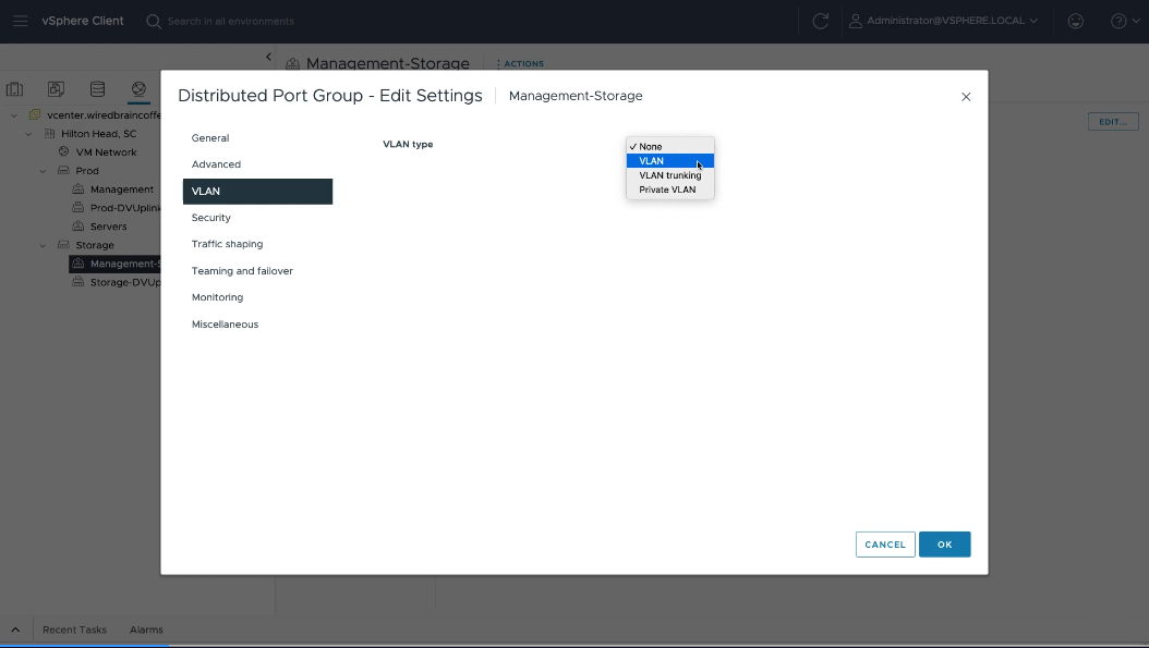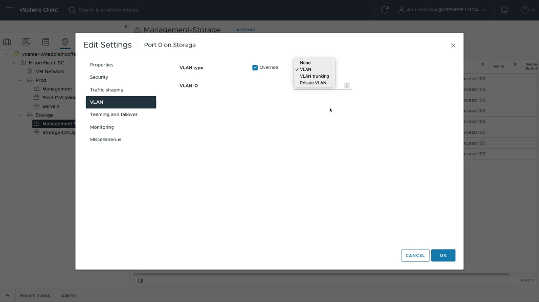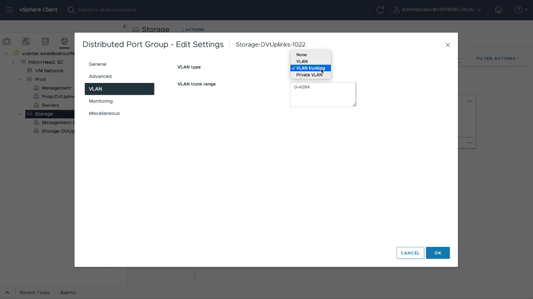 and that's because these are the uplinks that are connecting to the physical network. You'd wanna make sure that the VLAN trunk is configured to accept all the VLANs that are configrued across all of the Port Groups. Because those VLAN IDs would be sent up to the physical switches. With the uplinks serving as the VLAN trunks.