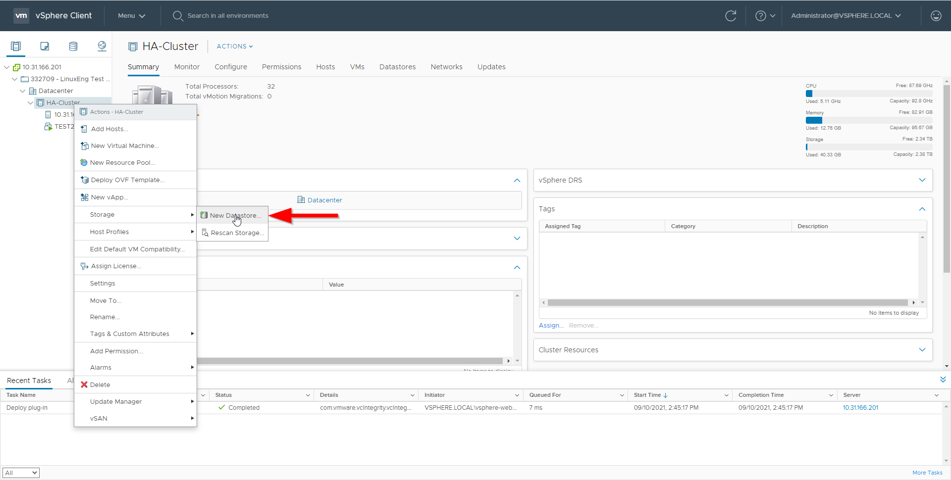 2. From the main vCenter tab right-click the "HA-Cluster",