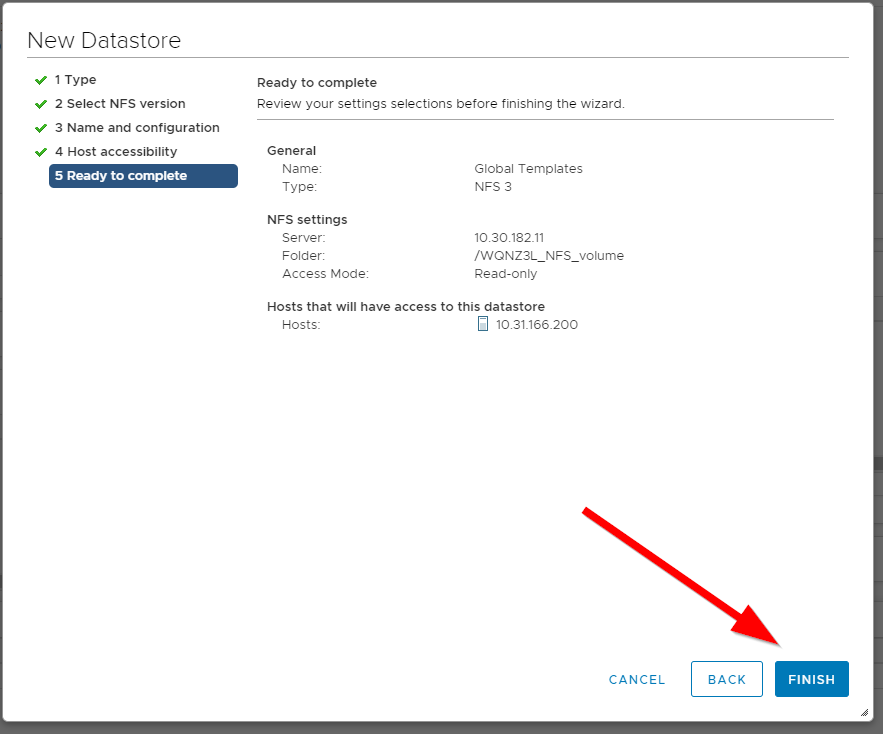 Finally, review to ensure that all the hosts have the datastore attached before proceeding to register VM Templates.