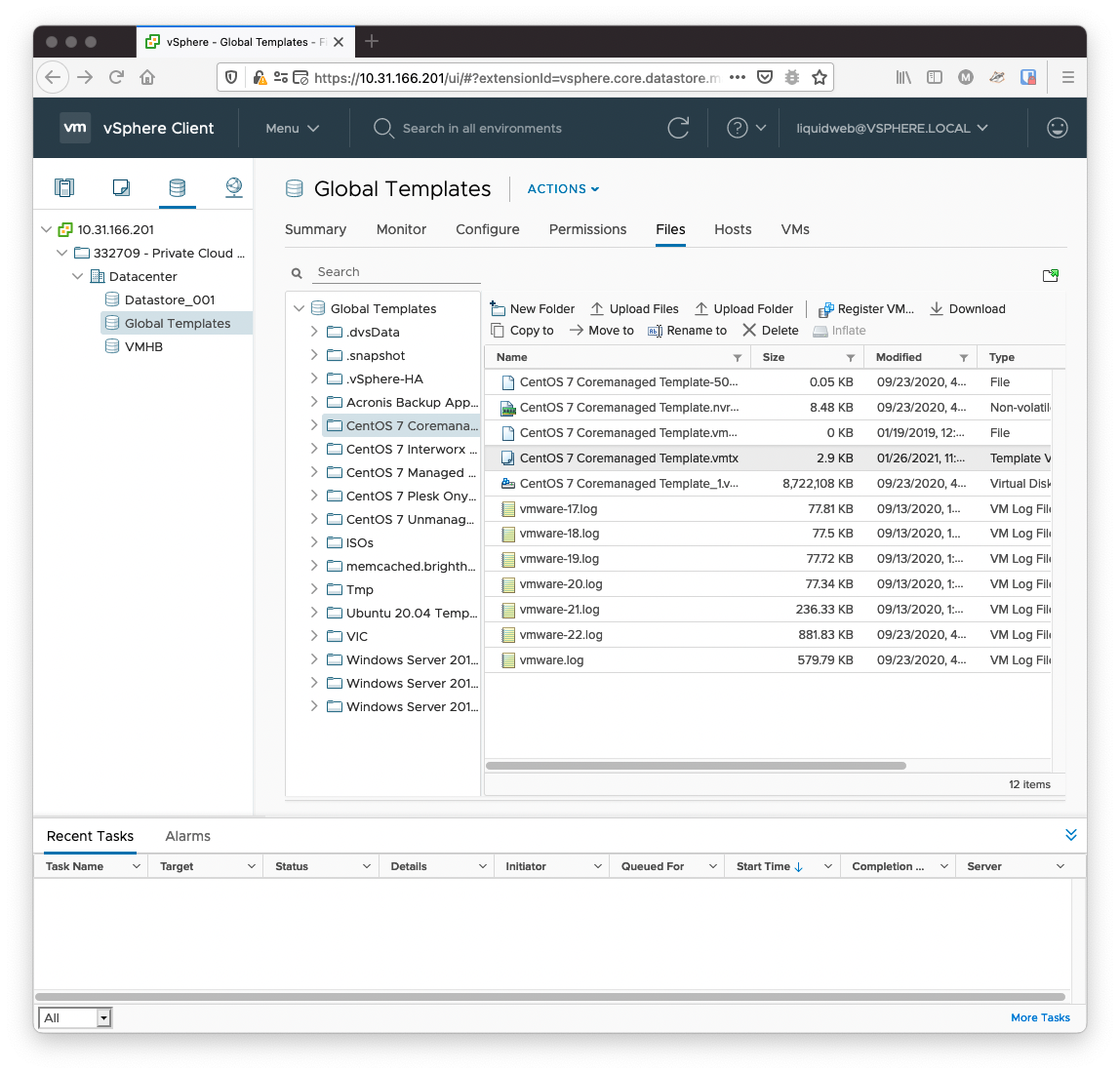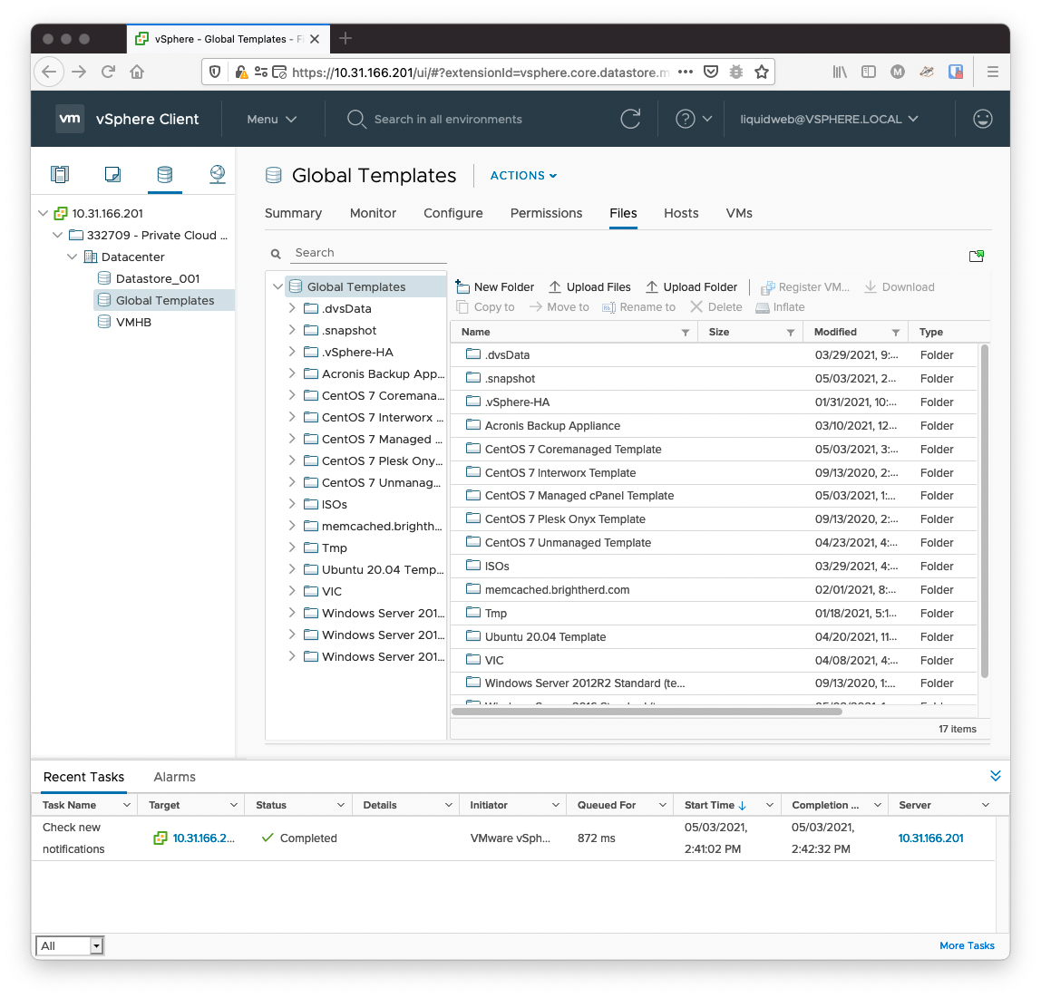 If you are looking at just the screenshot above you may be slightly confused at first. The Global Templates datastore was organized into a hierarchy when it was redone with the addition of vSphere 7.0 clusters. As such the folders are now separated for vSphere 6.7 and higher compatibility versus vSphere 7.0 and higher compatibility. In addition to being further broken down into separate folders for the Operatng System types of Linux and Windows, along with other things we need occasionally such as ISO images. As we now have over 23 Templates available this made the folder structure much cleaner than dumping them all into the root of the Global Templates folder